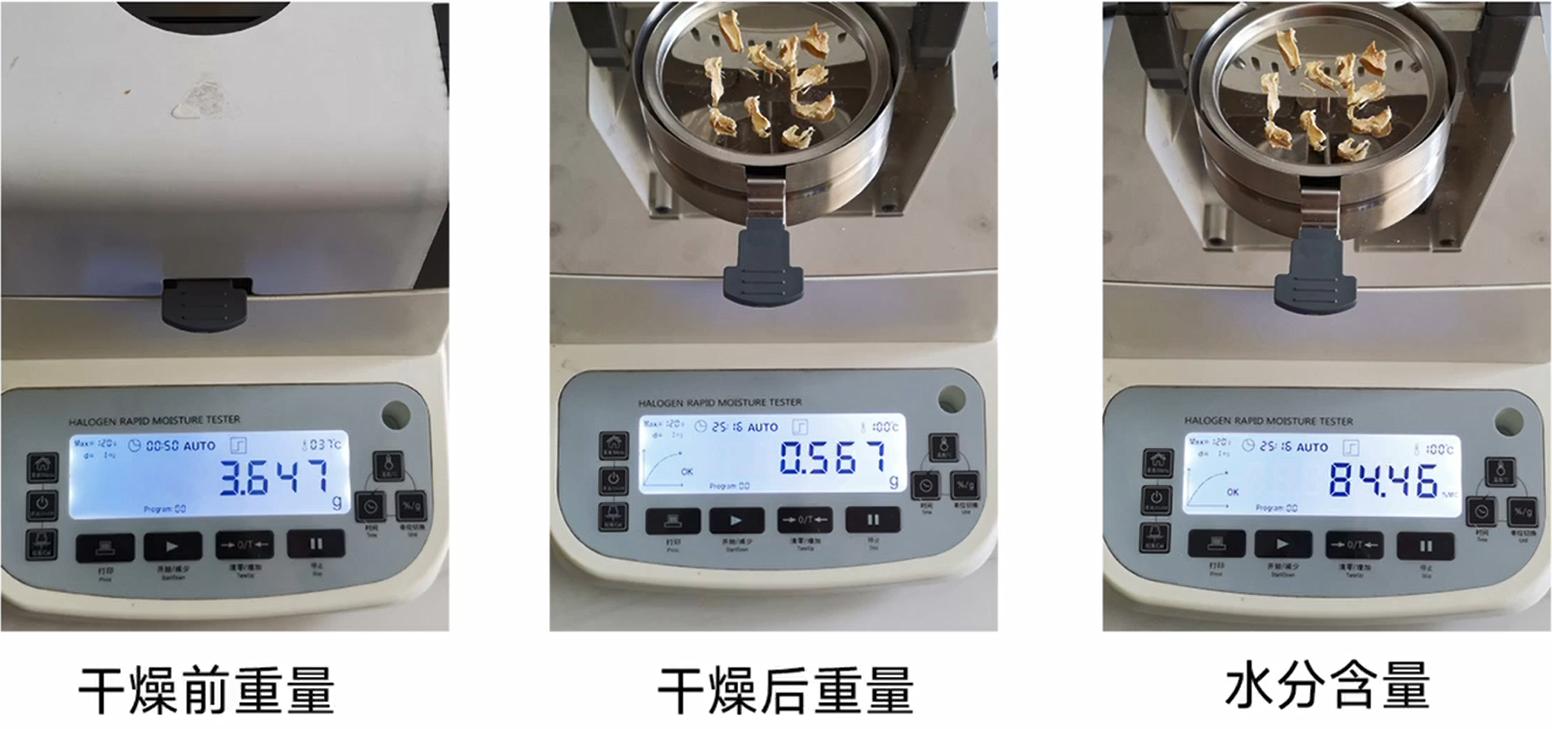 首先將測量溫度調整到100℃,然后將筍切成薄片,往樣品盤里加入3-5g的筍片,蓋上蓋子,等重量數值穩定后按開始鍵,儀器開始自動測量。